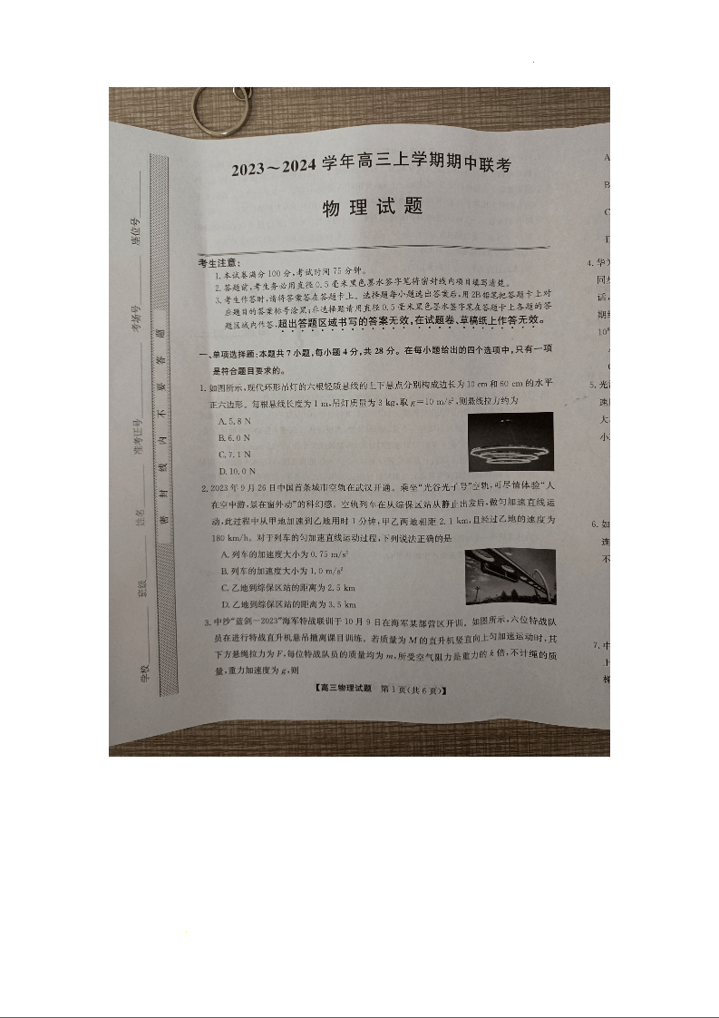 安徽省亳州市蒙城县2023—2024学年高三上学期期中联考 物理