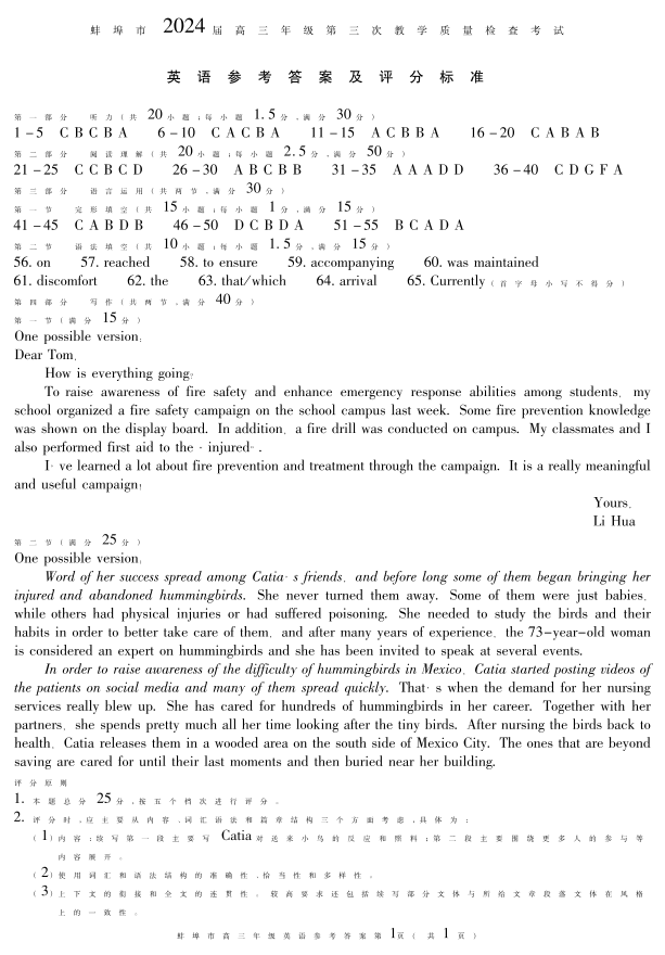 安徽省蚌埠市2023-2024学年高三下学期第三次教学质量检查 英语答案