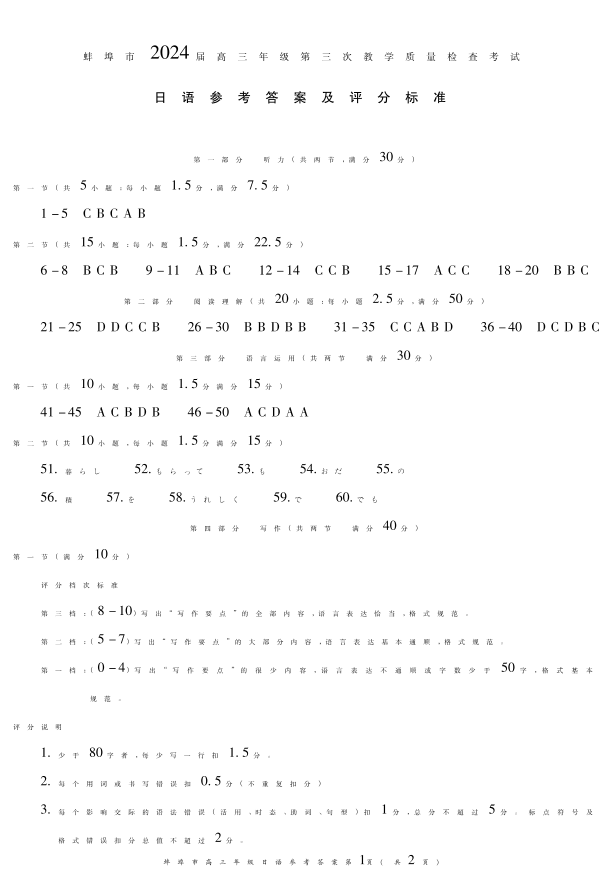 安徽省蚌埠市2023-2024学年高三下学期第三次教学质量检查 日语答案