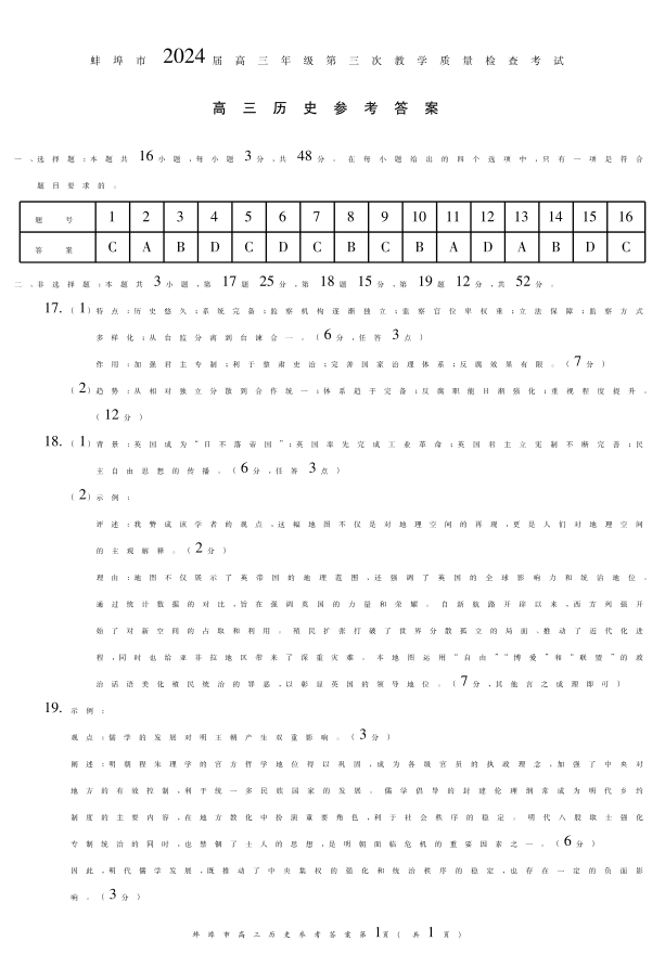 安徽省蚌埠市2023-2024学年高三下学期第三次教学质量检查 历史答案