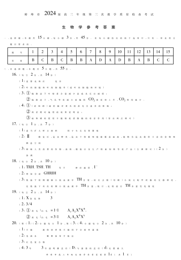 安徽省蚌埠市2023-2024学年高三下学期第三次教学质量检查 生物答案