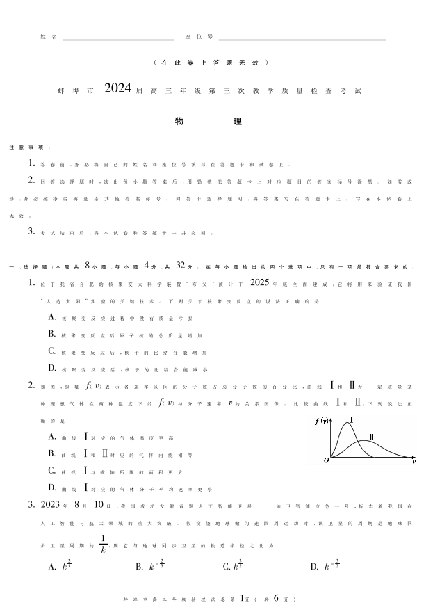 安徽省蚌埠市2023-2024学年高三下学期第三次教学质量检查 物理