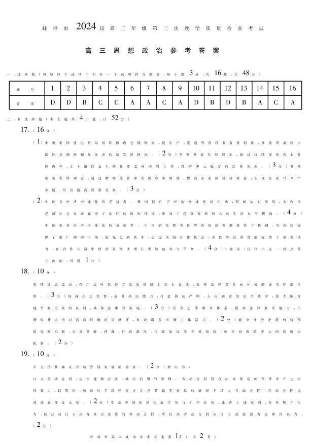 安徽省蚌埠市2023-2024学年高三下学期第三次教学质量检查 政治答案