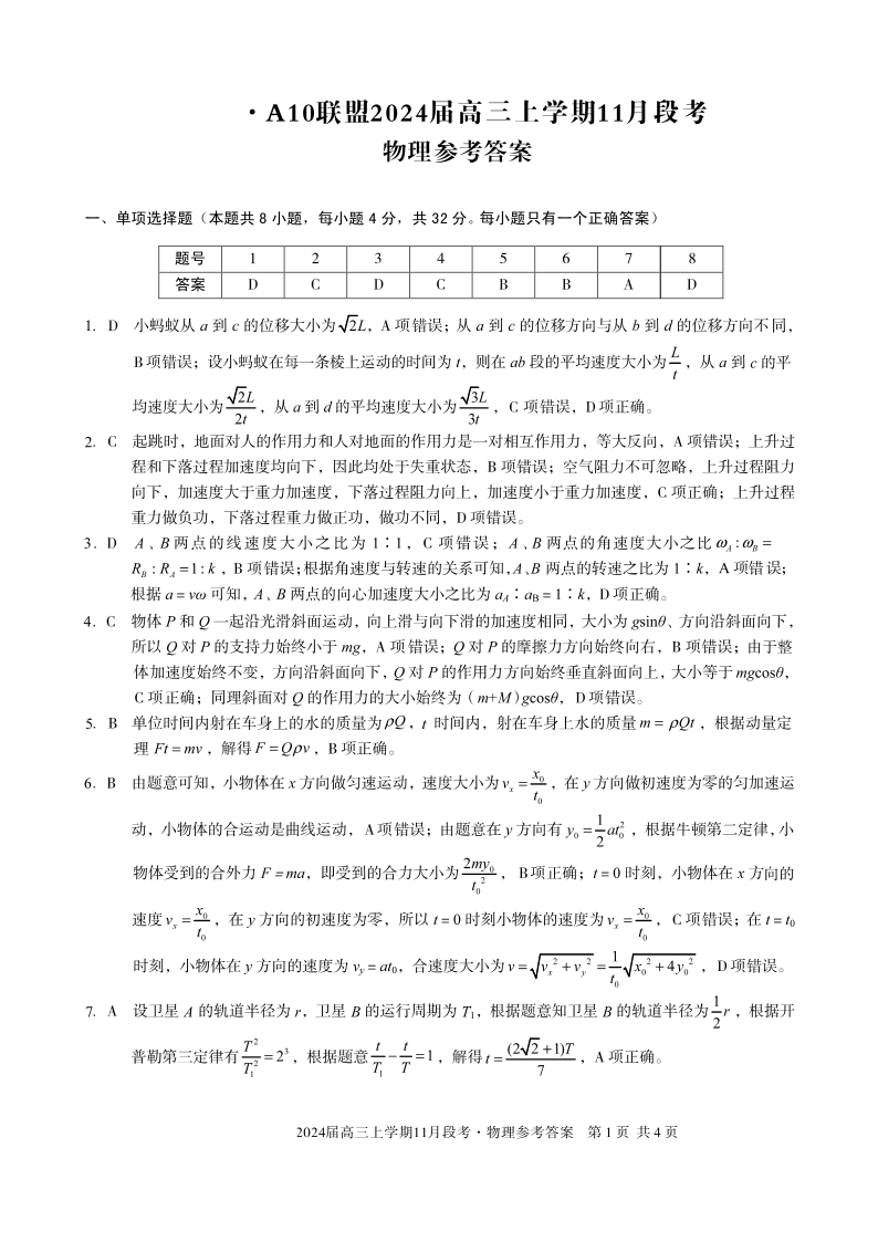 安徽省A10联盟2023-2024学年高三上学期11月期中考试 物理答案