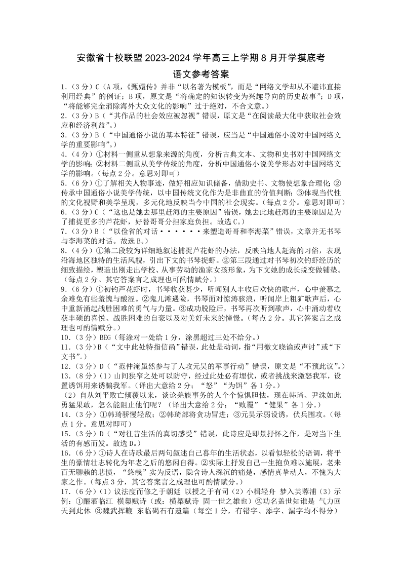 安徽省A10联盟2024届高三上学期8月开学摸底考试 语文答案
