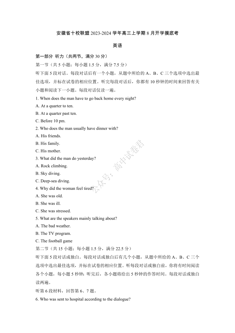 安徽省A10联盟2024届高三上学期8月开学摸底考试 英语