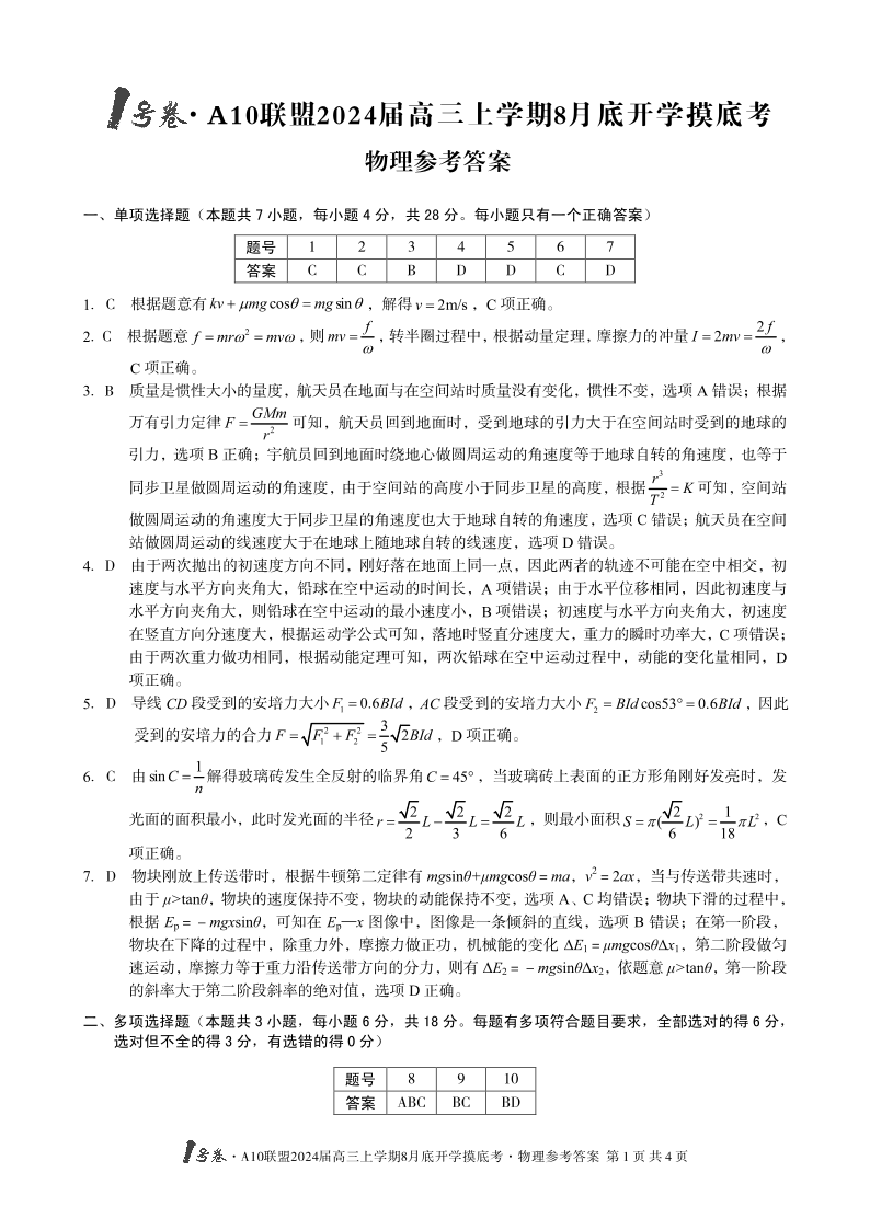 安徽省A10联盟2024届高三上学期8月开学摸底考试 物理答案