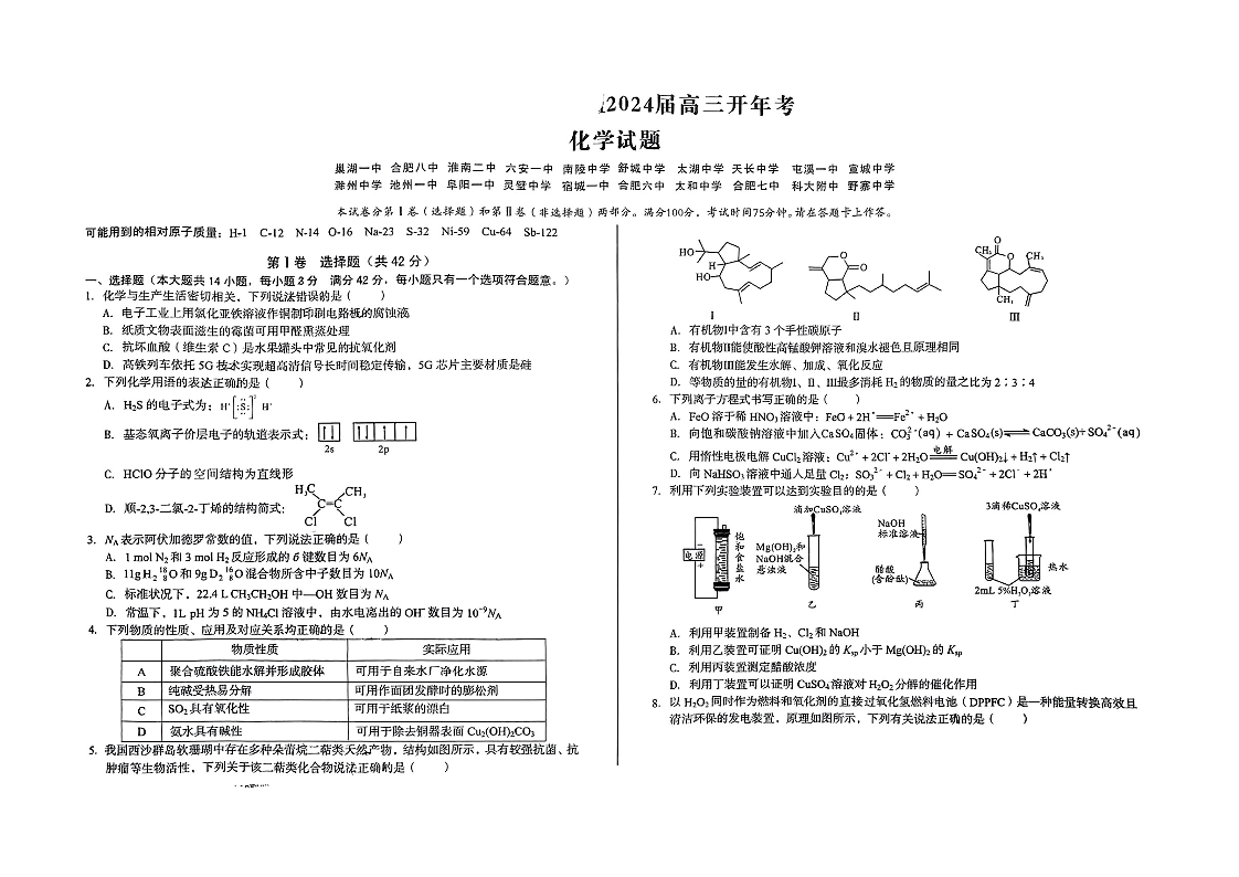 安徽省A10+联盟2023-2024学年高三下学期开年考 化学