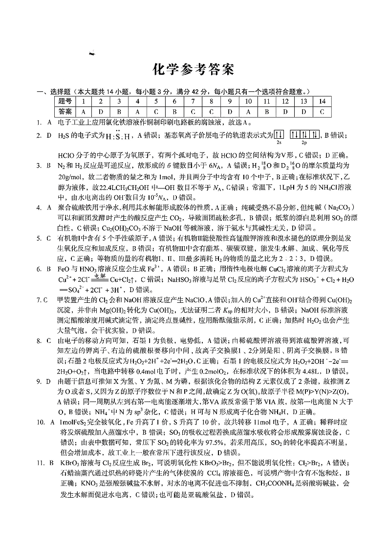 安徽省A10+联盟2023-2024学年高三下学期开年考 化学答案