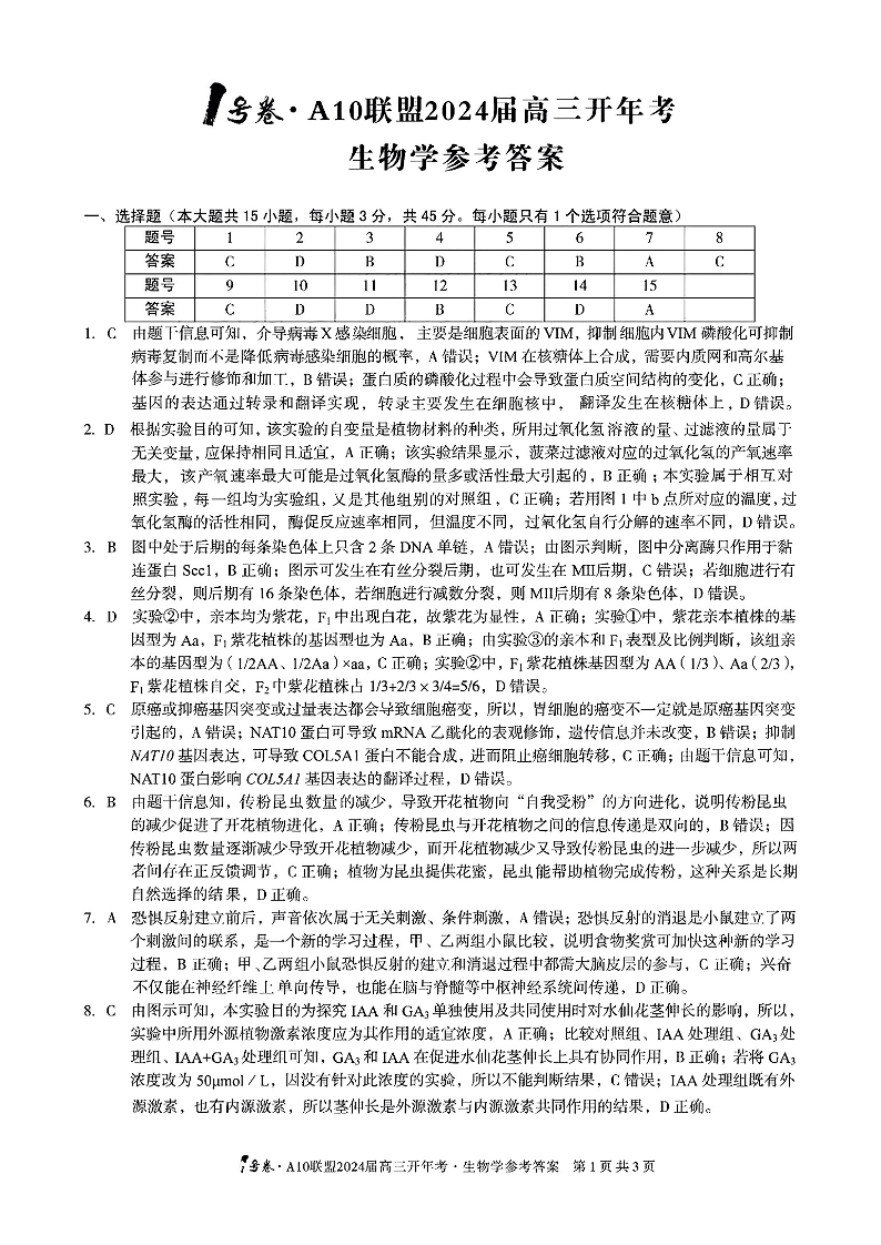 安徽省A10+联盟2023-2024学年高三下学期开年考 生物答案