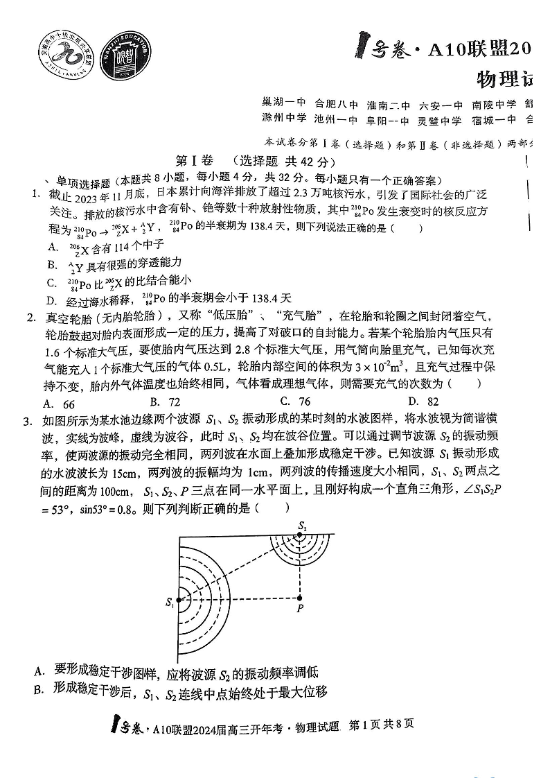 安徽省A10+联盟2023-2024学年高三下学期开年考 物理