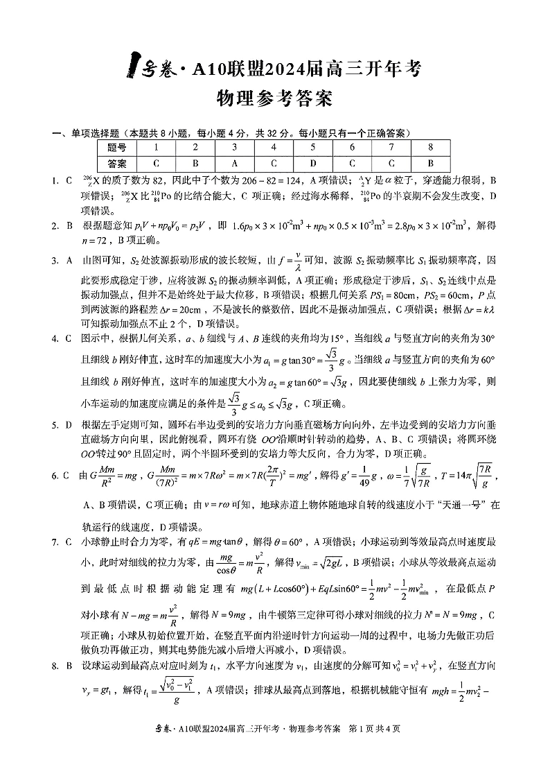 安徽省A10+联盟2023-2024学年高三下学期开年考 物理答案