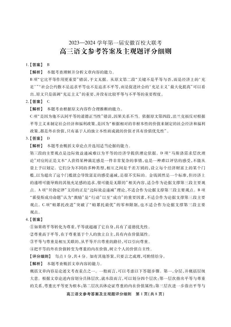 安徽省2023-2024学年高三上学期第一届百校大联考 语文答案