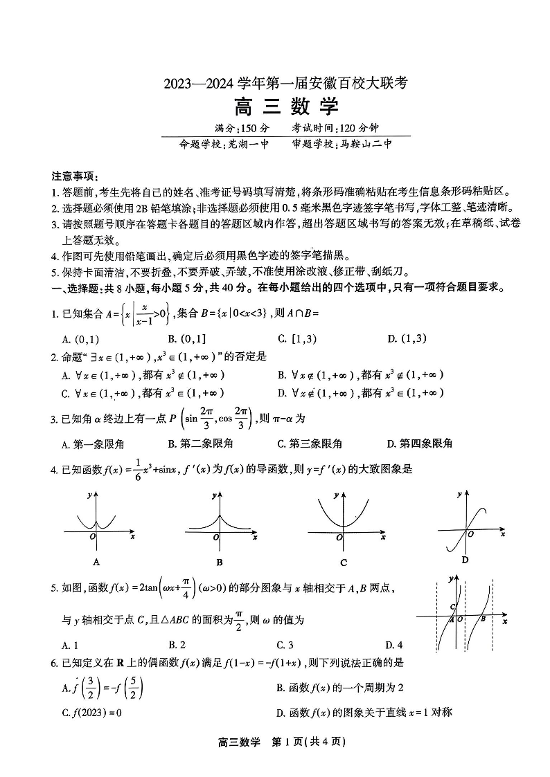 安徽省2023-2024学年高三上学期第一届百校大联考 数学