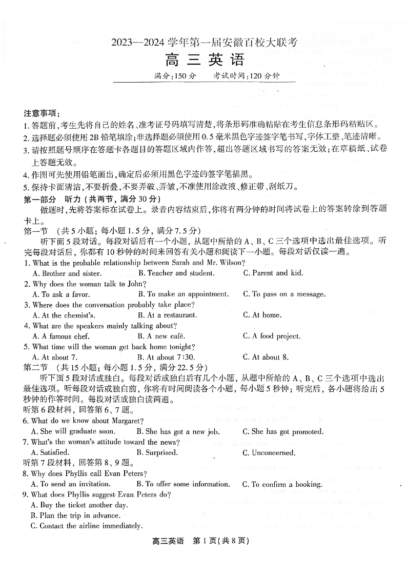 安徽省2023-2024学年高三上学期第一届百校大联考 英语