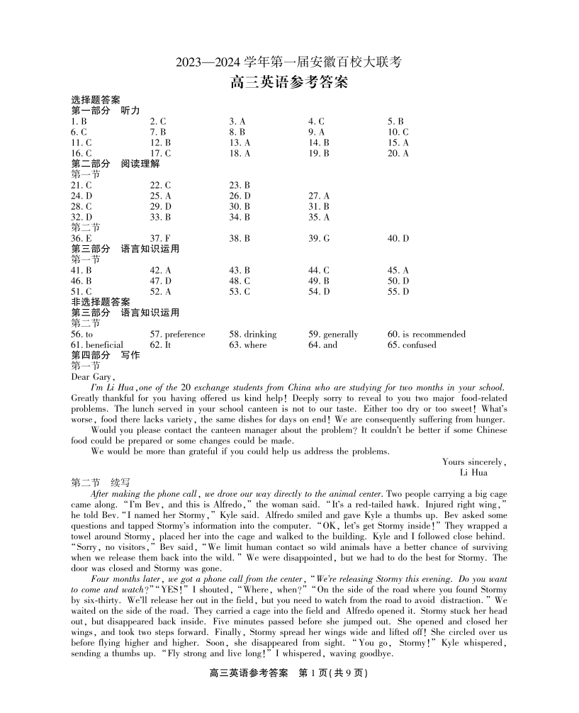安徽省2023-2024学年高三上学期第一届百校大联考 英语答案