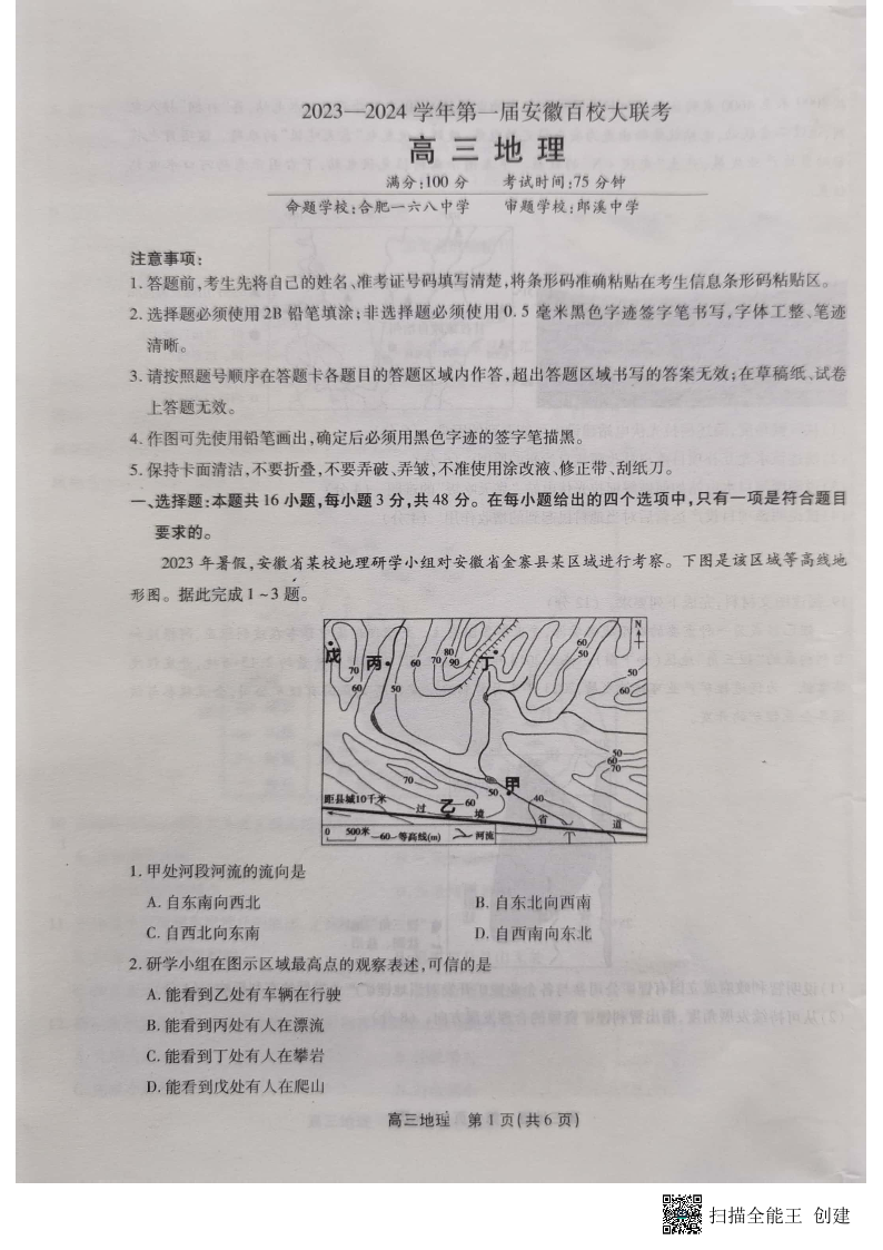 安徽省2023-2024学年高三上学期第一届百校大联考 地理