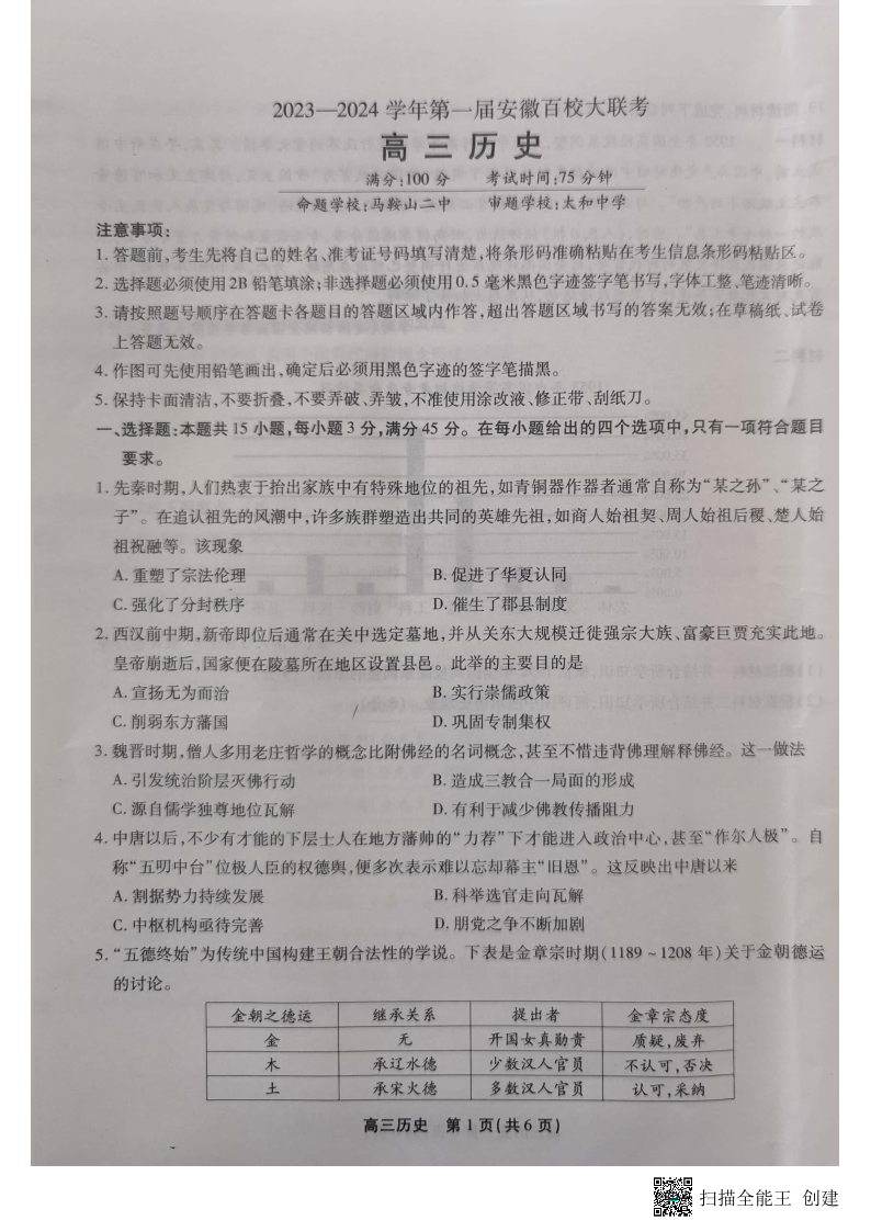 安徽省2023-2024学年高三上学期第一届百校大联考 历史