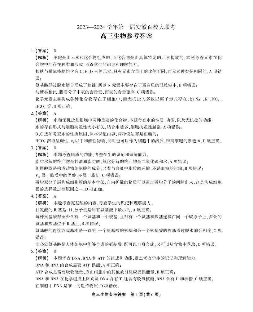 安徽省2023-2024学年高三上学期第一届百校大联考 生物答案
