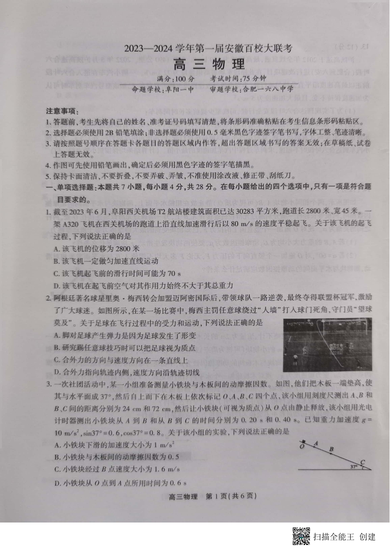 安徽省2023-2024学年高三上学期第一届百校大联考 物理