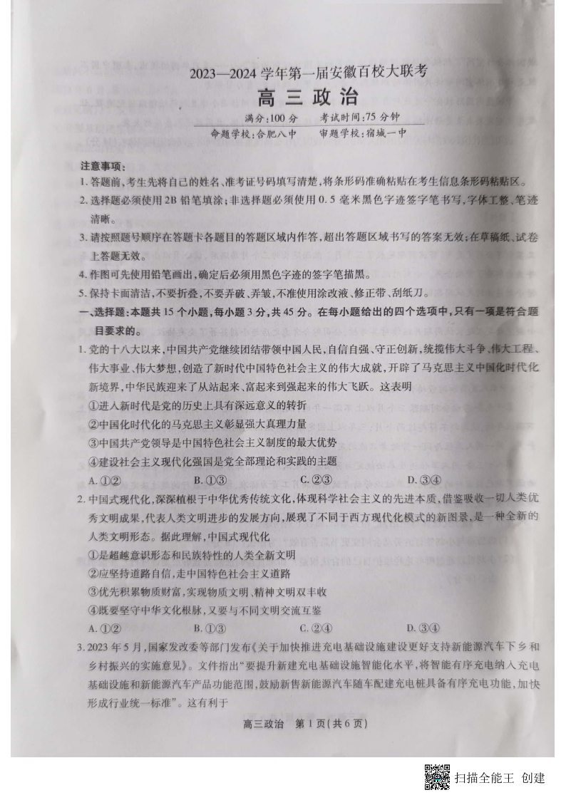 安徽省2023-2024学年高三上学期第一届百校大联考 政治