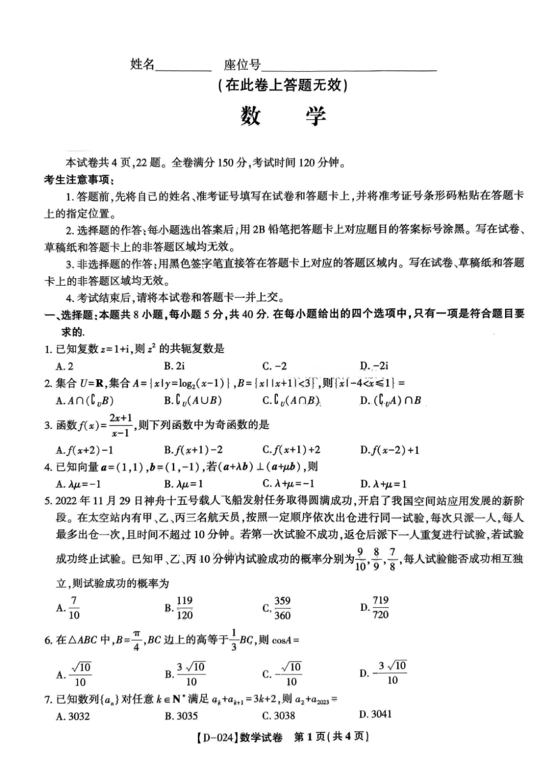 安徽省“皖江名校联盟”2023-2024学年高三上学期12月月考 数学