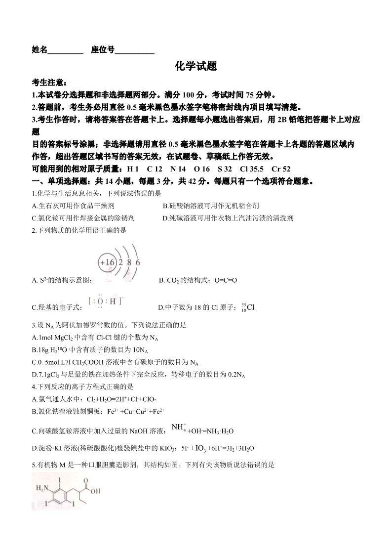 安徽省“皖江名校联盟”2023-2024学年高三上学期12月月考 化学
