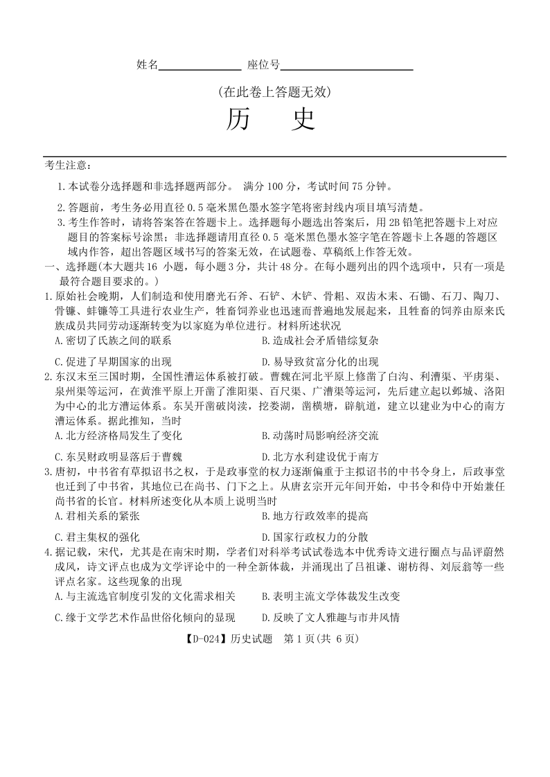 安徽省“皖江名校联盟”2023-2024学年高三上学期12月月考 历史