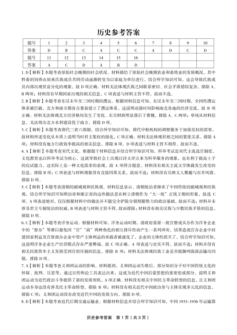 安徽省“皖江名校联盟”2023-2024学年高三上学期12月月考 历史答案