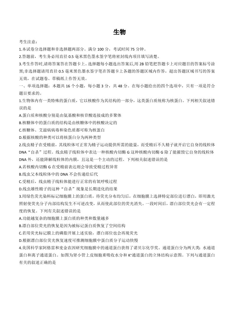 安徽省“皖江名校联盟”2023-2024学年高三上学期12月月考 生物