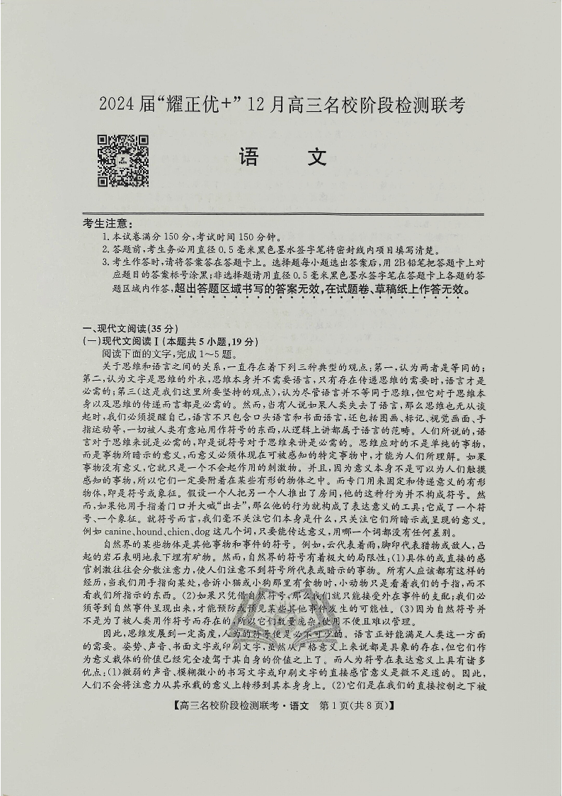 2024届“耀正优+”12月高三名校阶段检测联考 语文