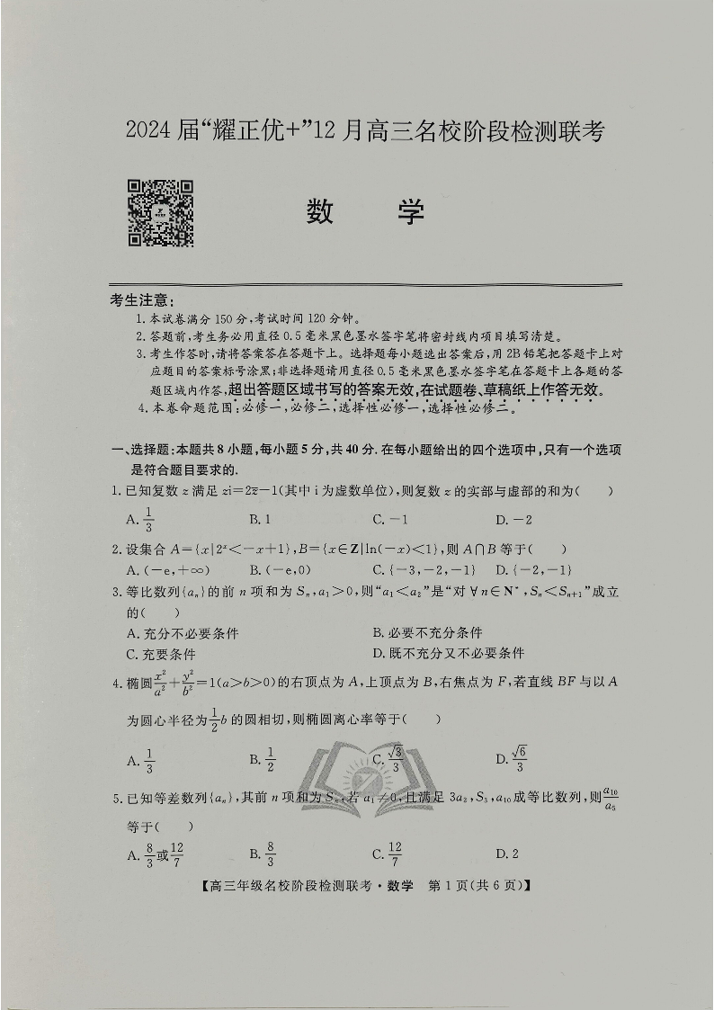 2024届“耀正优+”12月高三名校阶段检测联考 数学