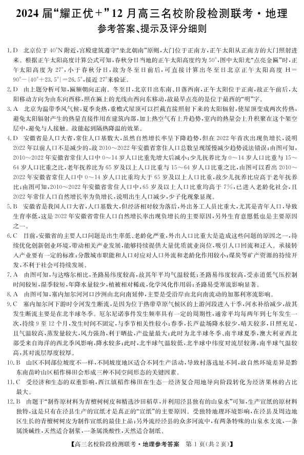 2024届“耀正优+”12月高三名校阶段检测联考 地理答案