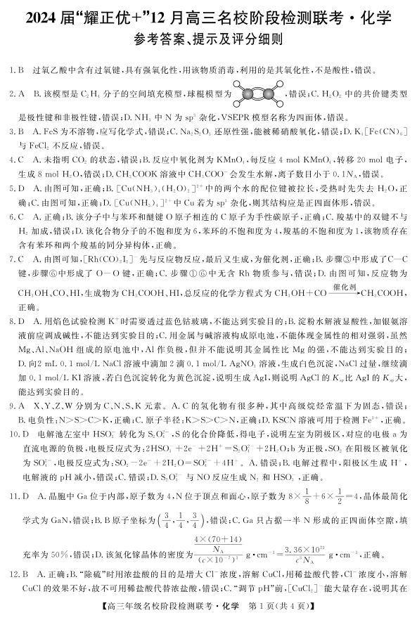 2024届“耀正优+”12月高三名校阶段检测联考 化学答案