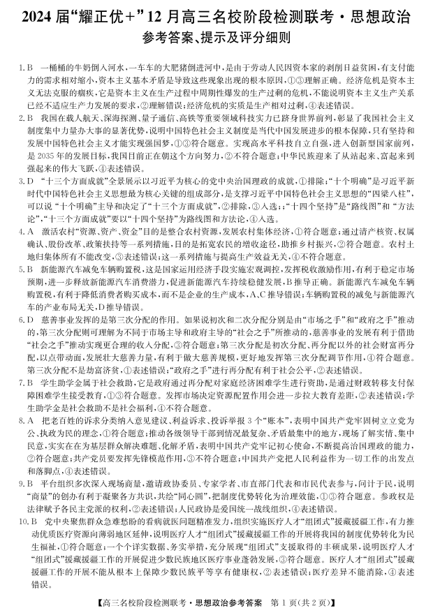 2024届“耀正优+”12月高三名校阶段检测联考 政治答案