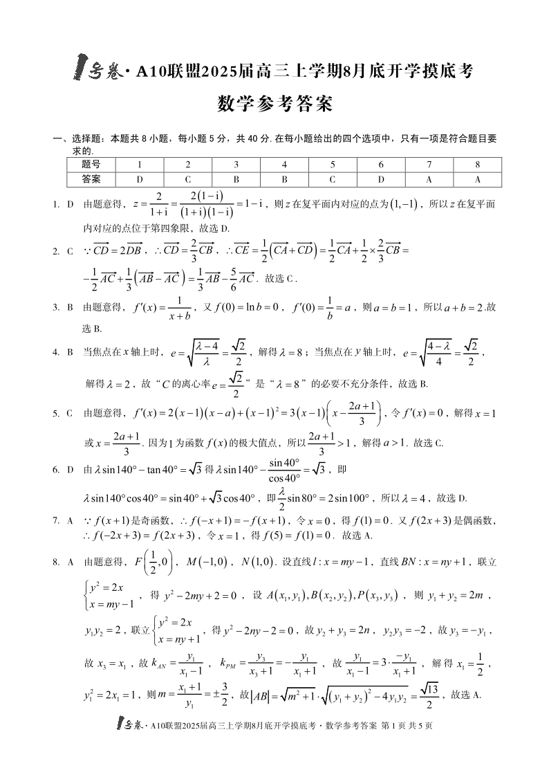 安徽省1号卷A10联盟2025届高三上学期8月开学摸底考试+数学答案