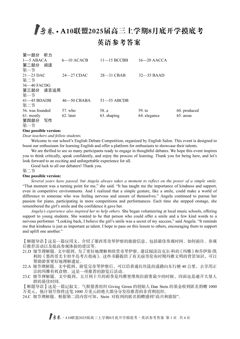 安徽省1号卷A10联盟2025届高三上学期8月开学摸底考试+英语答案