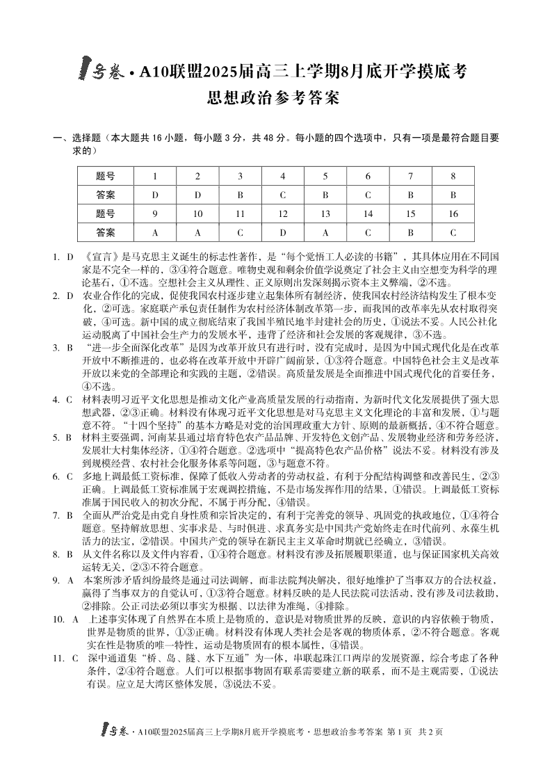 安徽省1号卷A10联盟2025届高三上学期8月开学摸底考试+思想政治答案