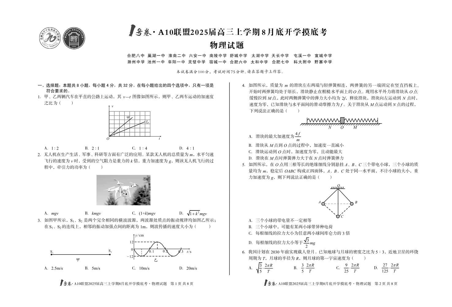 安徽省1号卷A10联盟2025届高三上学期8月开学摸底考试+物理