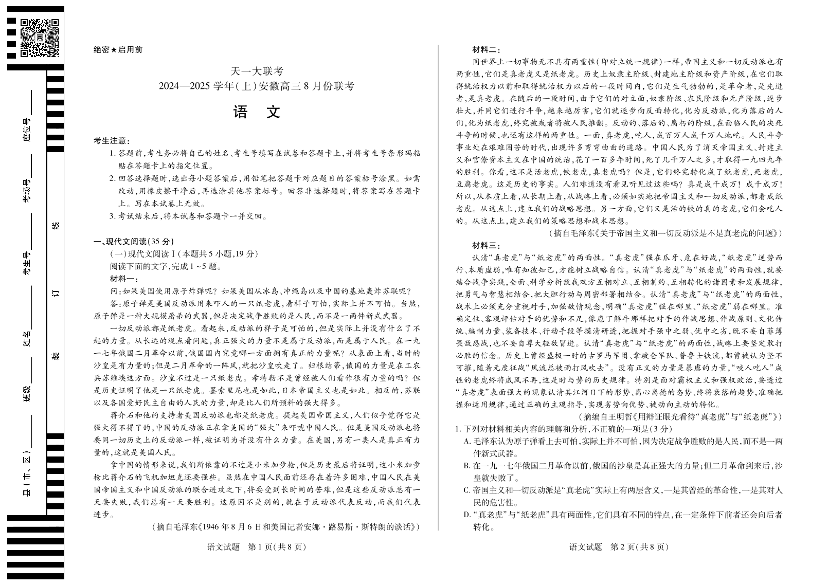 天一大联考2024-2025学年(上)安徽高三8月份联考+语文