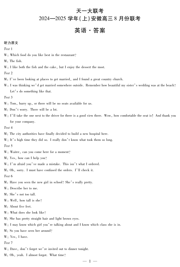 天一大联考2024-2025学年(上)安徽高三8月份联考+英语答案