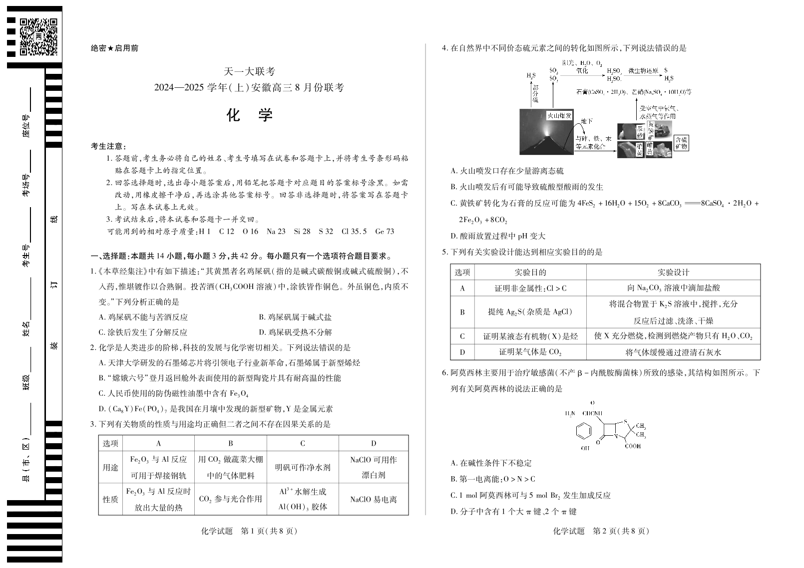 天一大联考2024-2025学年(上)安徽高三8月份联考+化学