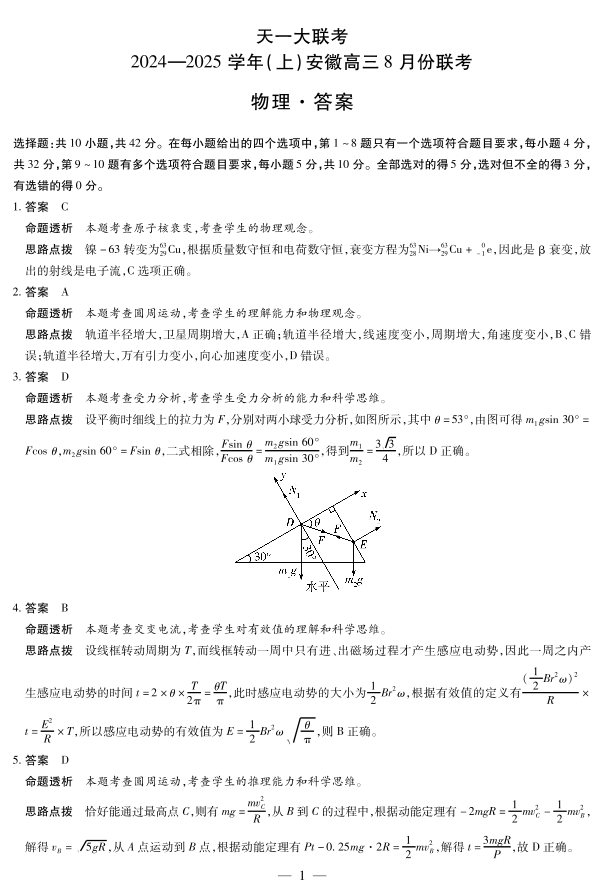 天一大联考2024-2025学年(上)安徽高三8月份联考+物理答案
