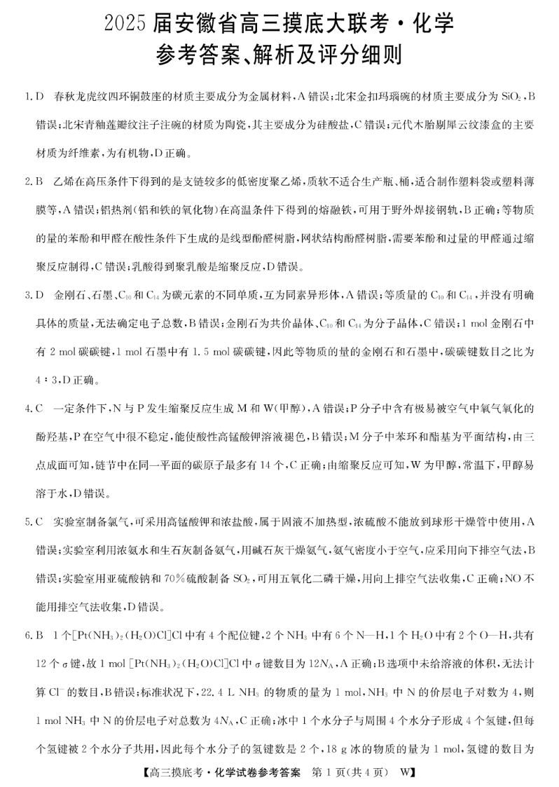 2025届安徽省皖南八校高三摸底考试+化学答案