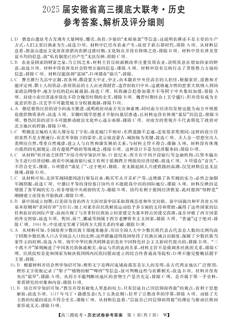 2025届安徽省皖南八校高三摸底考试+历史答案