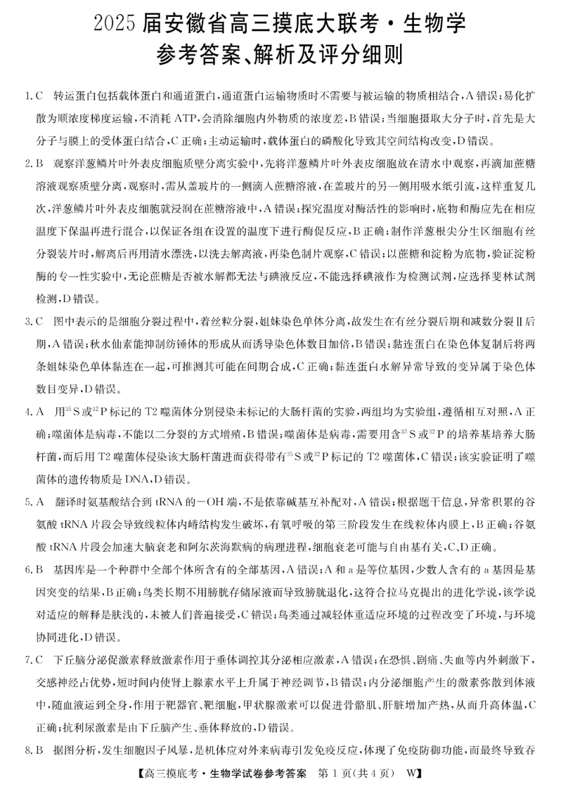2025届安徽省皖南八校高三摸底考试+生物答案