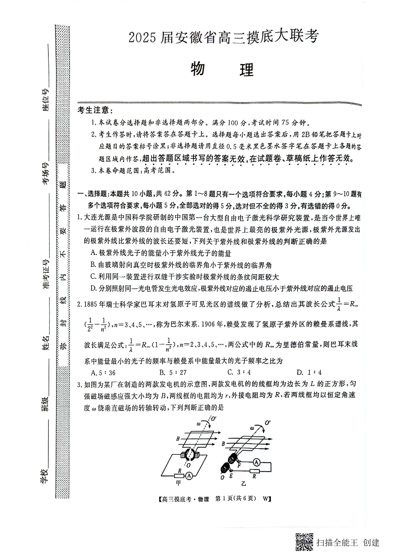 2025届安徽省皖南八校高三摸底考试+物理