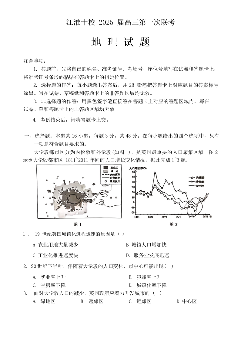安徽省江淮十校2025届高三年级第一次联考+地理