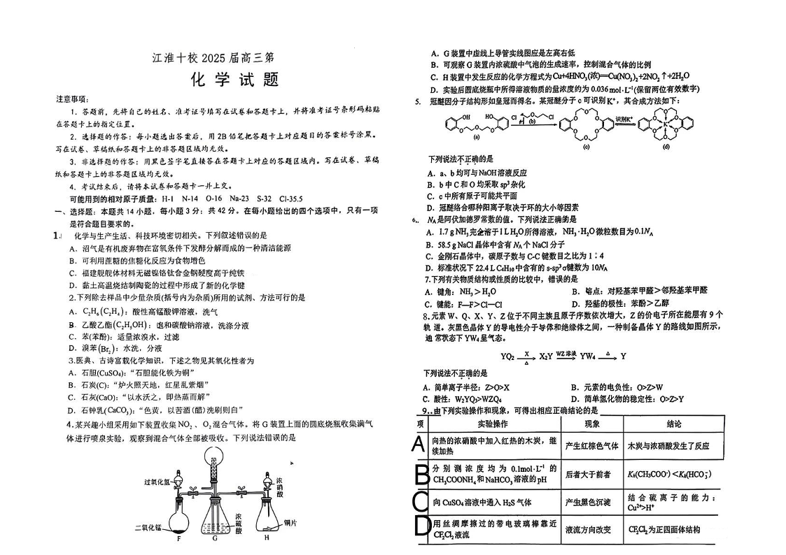 安徽省江淮十校2025届高三年级第一次联考+化学