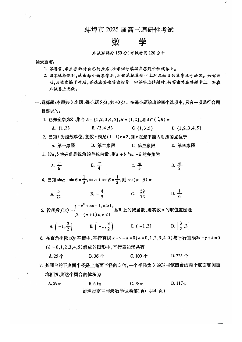 安徽省蚌埠市2025届高三年级上学期8月调研性考试+数学